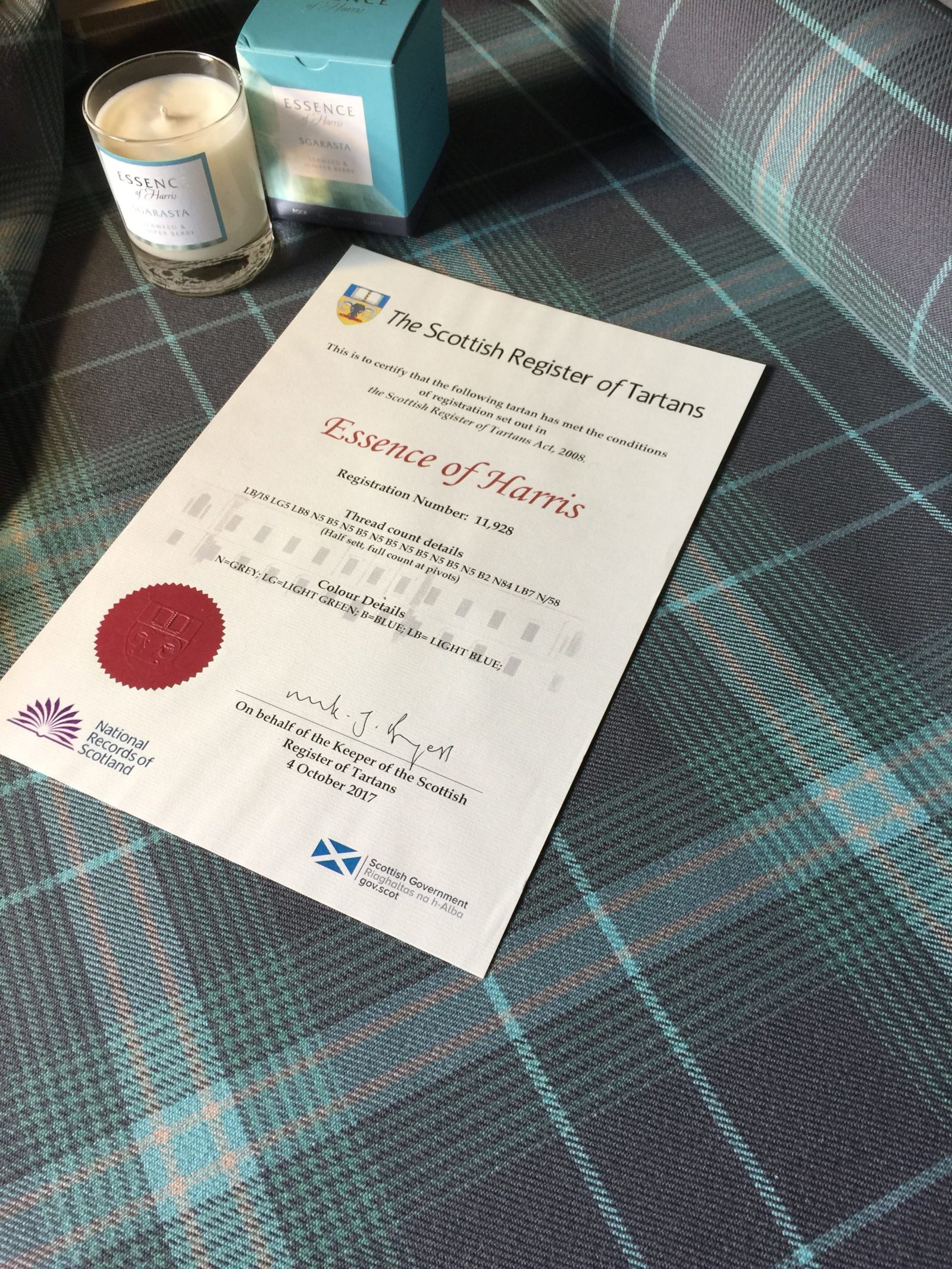 Essence of Harris now use their tartan in a stunning line of products from flasks to bags to bespoke products. Further to that the tartan design is a key feature within their scented range packaging, we are so proud that it plays such an prestigious role in the story of their brand.